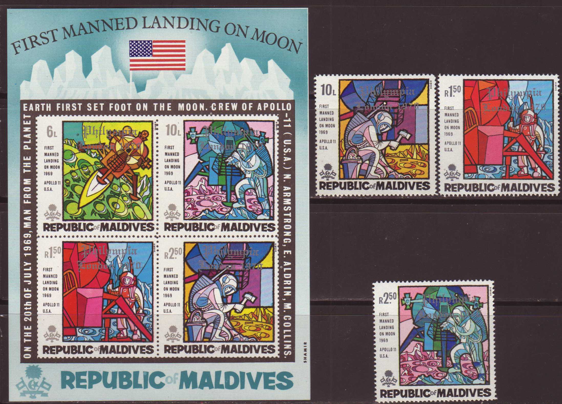| N83255 | Мальдивские острова. 1969-70. Высадка человека на Луну. Серия 3 марки и сувенирный лист, надпечатка, (**) |  | 480 |  |