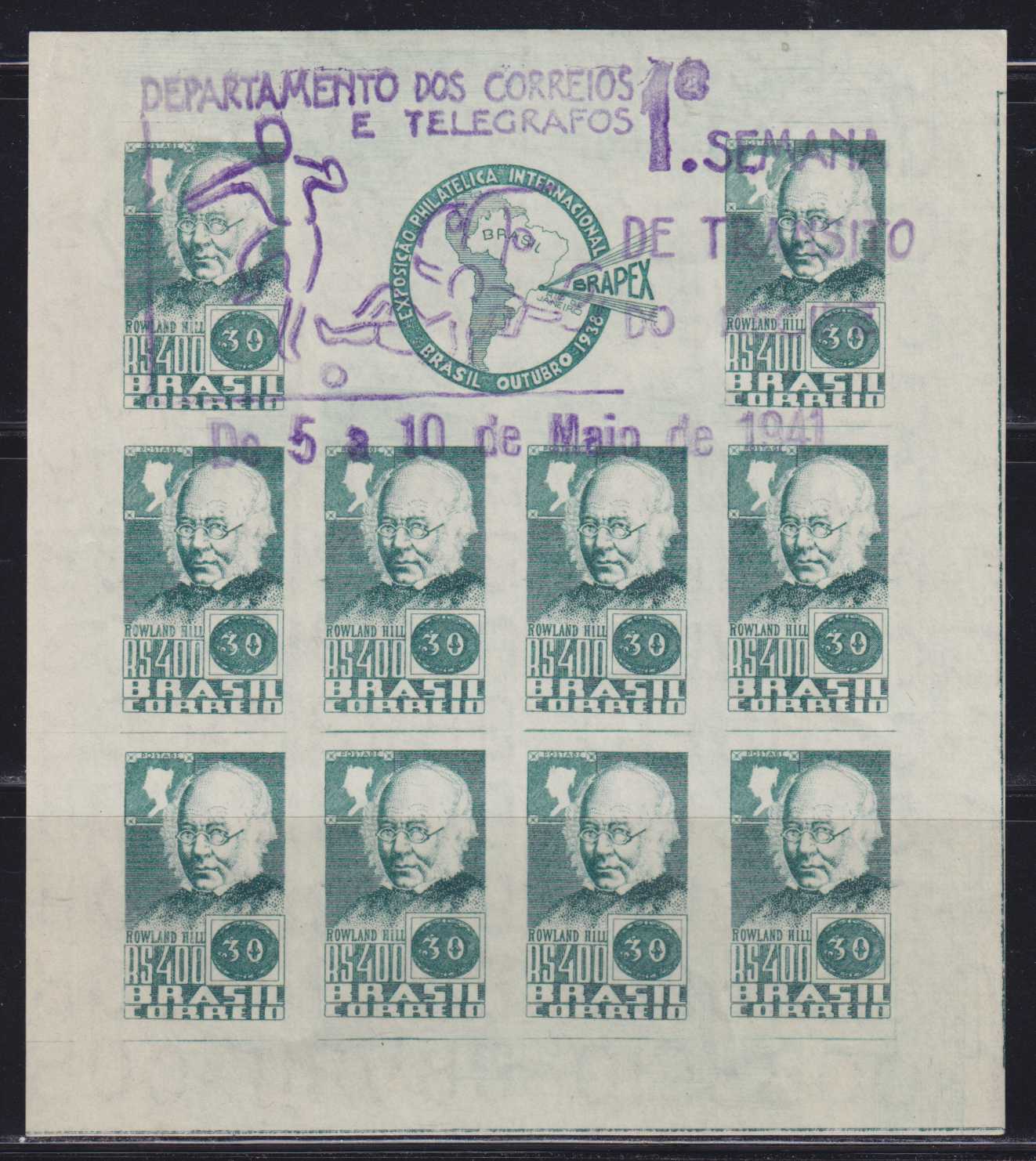 | N126723 | Бразилия 1938. Роланд Хилл. Сувенирный лист 10 марок с надпечаткой (**) (Scott08-20$) |  | 1730 |  |