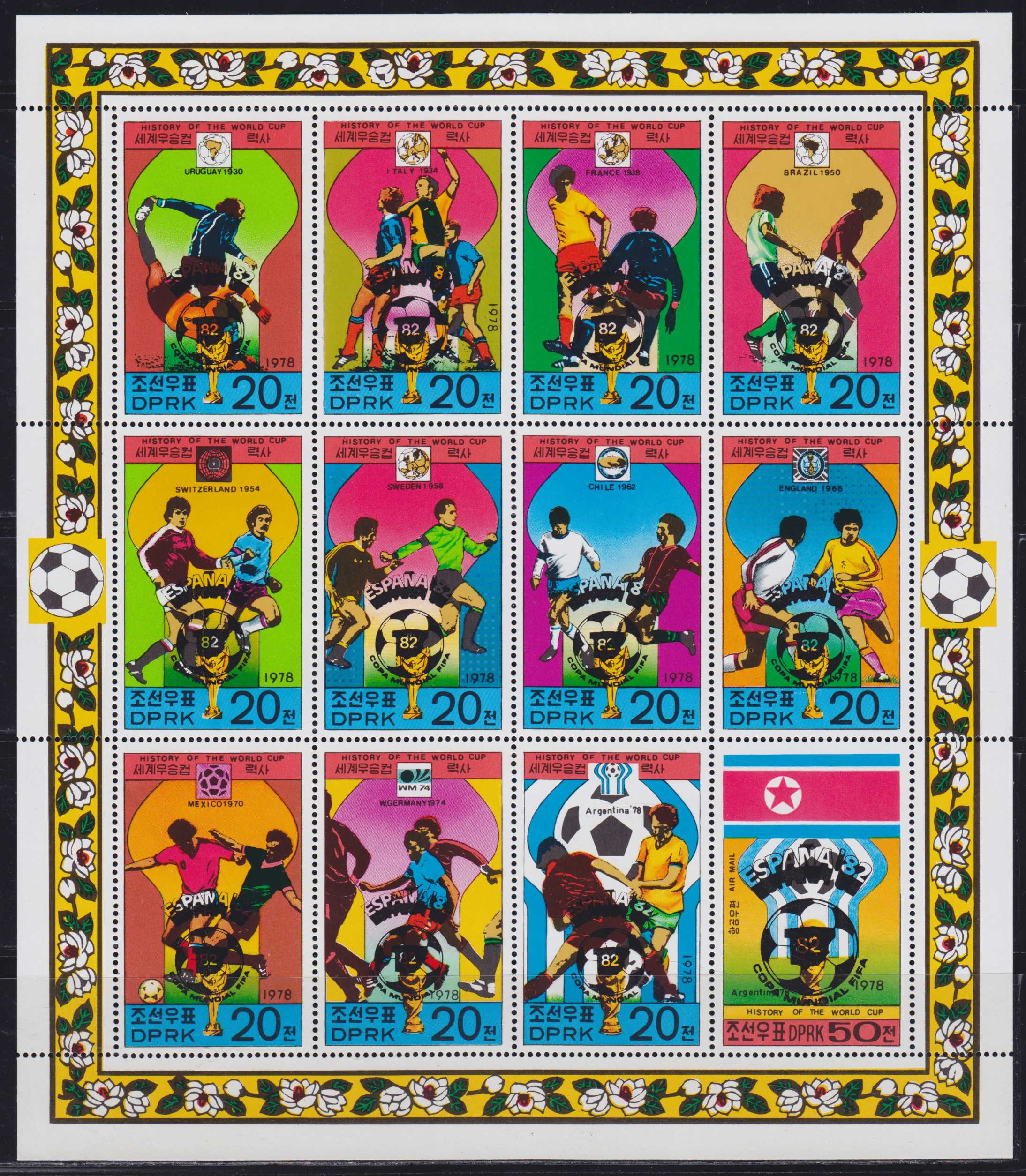 Сальвадор 1982. Чемпионат мира по футболу и флаги. Серия 4 сувенирных листа (**). Листы с черными и синими номерами. Лист с синим номером имеет редкую разновидность в гербе Перу - пропуск красного цвета внизу