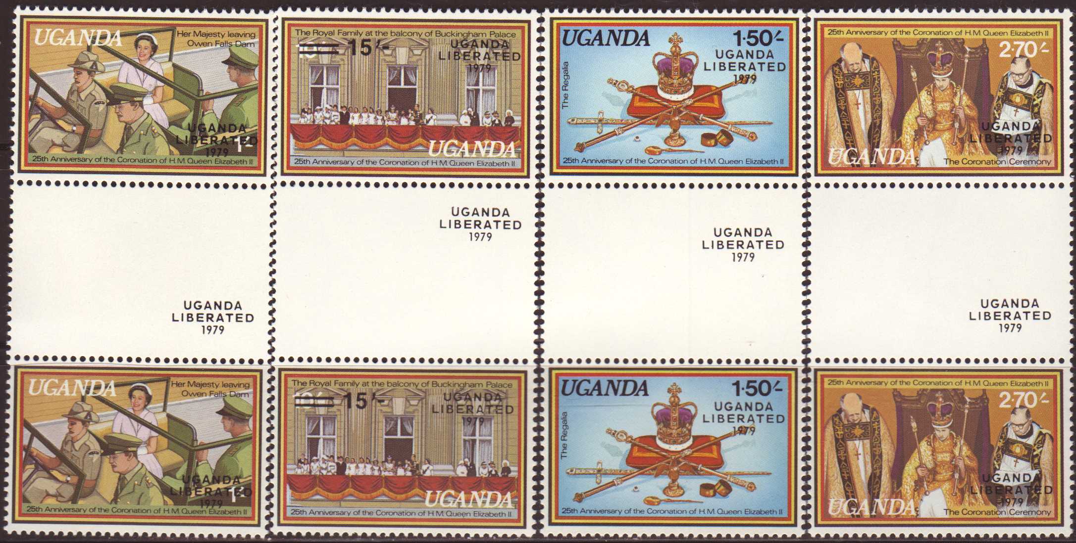 | N10856 | Уганда. 1979. 25-я годовщина коронации Елизаветы II, серия 4 марки с надпечаткой в парах с дорожкой, (**) |  | 360 |  |