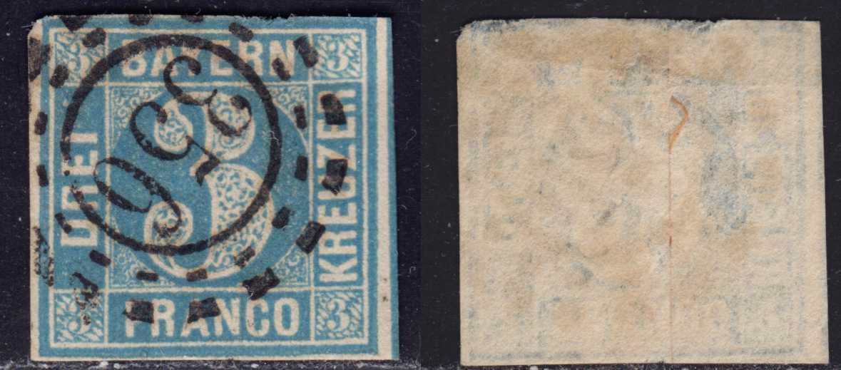 | N15904 | Бавария 1849. Марка синего цвета (плата 1 - неамкнутый круг), с запрессованной красной шелковой нитью, гаш номерным штемпелем |  | 3600 |  |