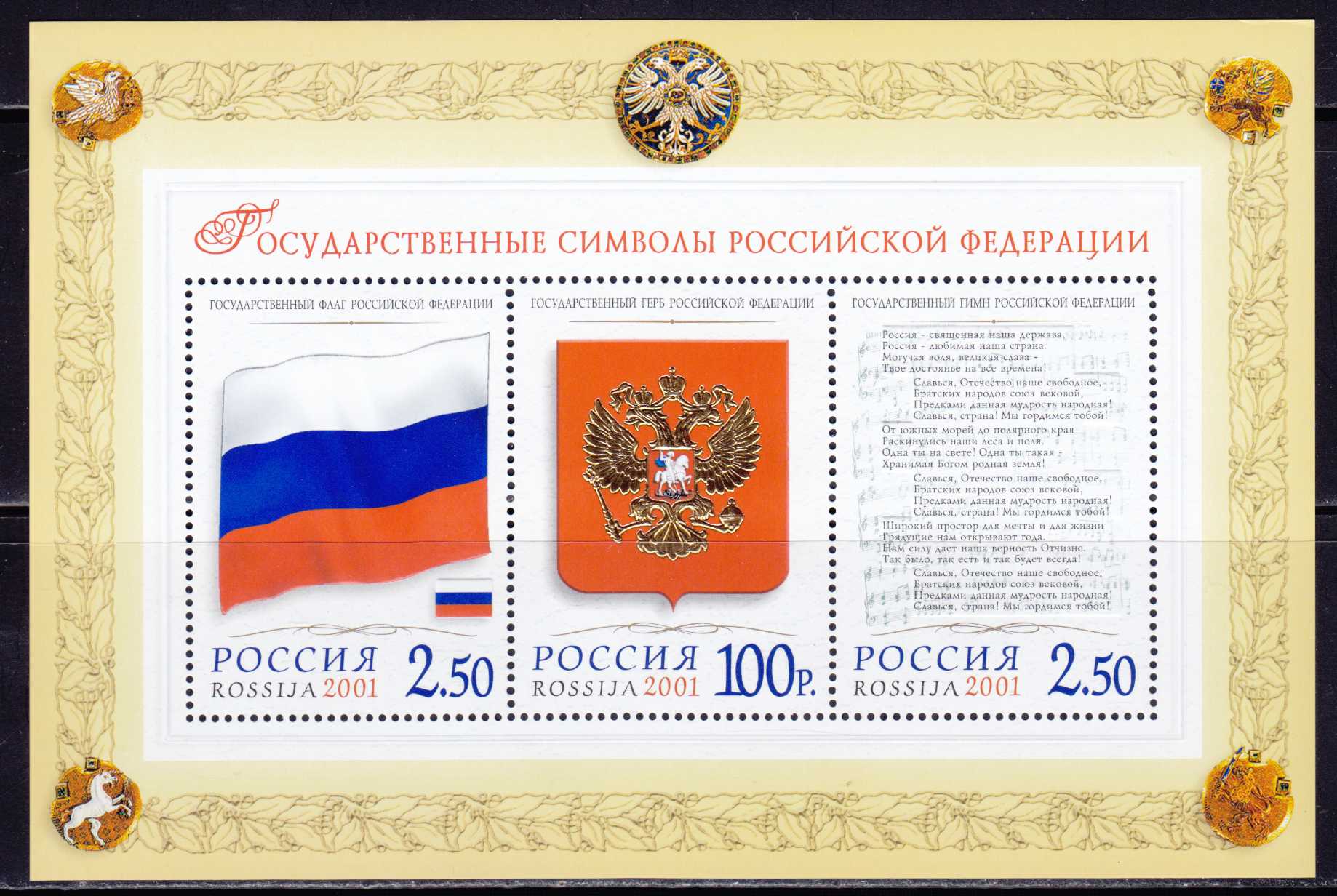 | N25426 | Россия 2001. Госуддарственные символы. Сувенирный лист 3 марки с сертификатом (**) |  | 1080 |  |