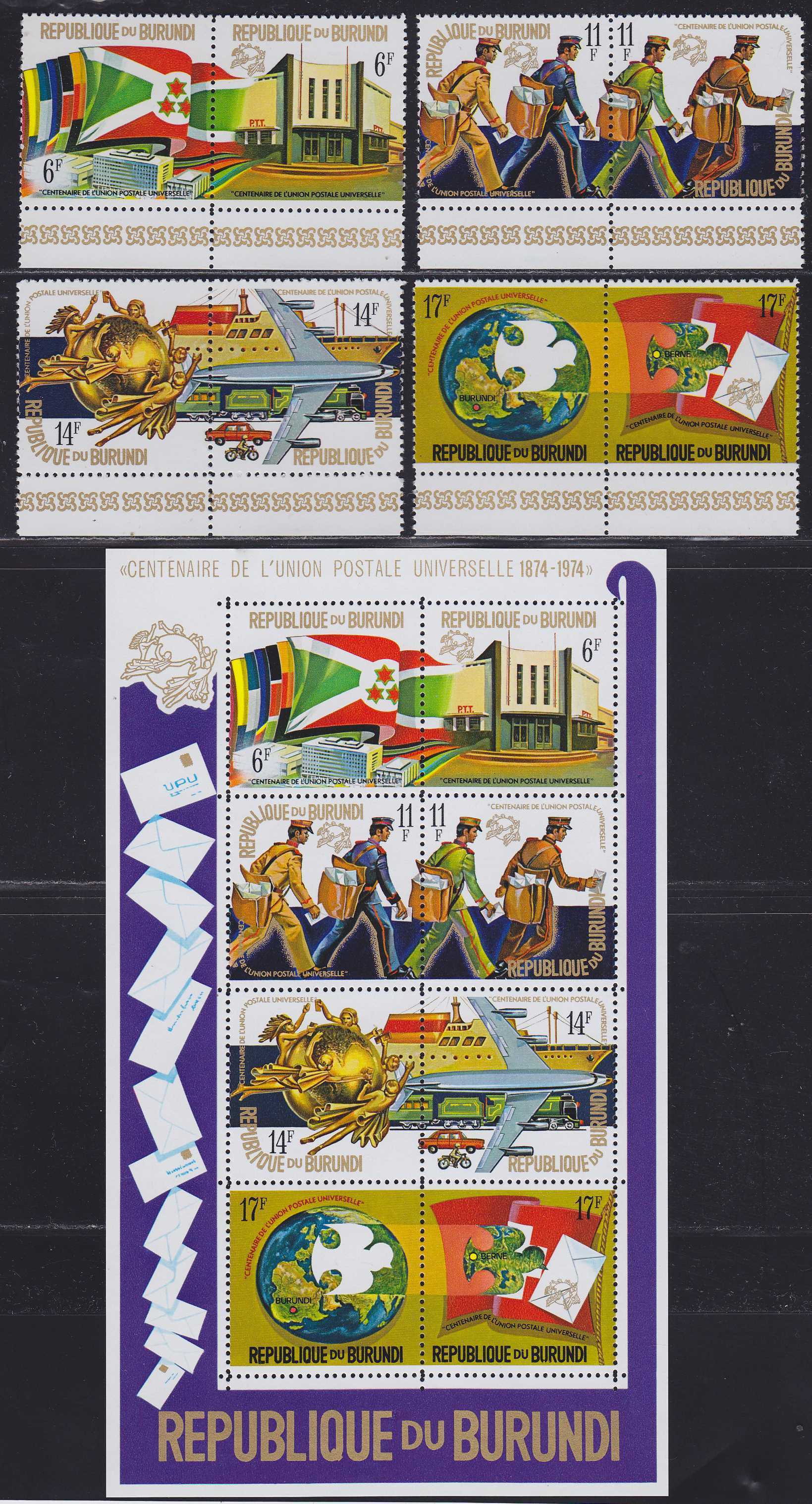 N168986Бурунди 1974. Всемирый почтовый союз. Серия 8 марок в сцепках и сувенирный лист (**) 1400Контакт