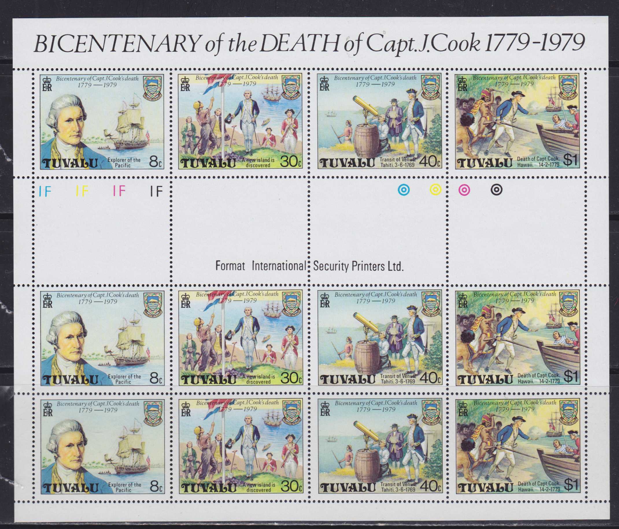 N164047Тувалу 1979. Парусники и капитан Кук. Лист 3 сцепки по 4 марки через доржку (**) 600Контакт