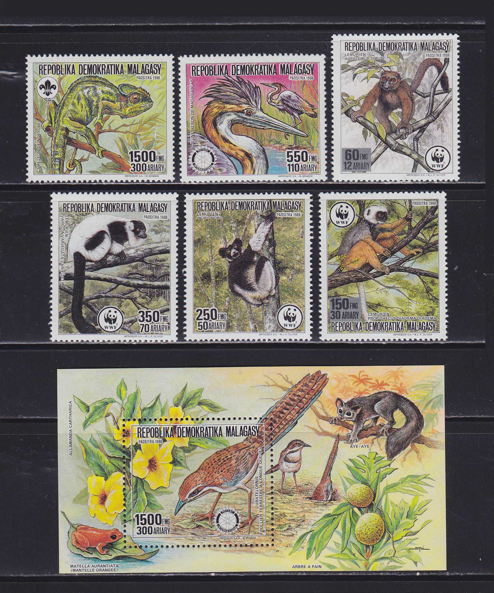 | N158280 | Мадагаскар 1988. Фауна и бойскауты. Серия 6 марок и 3 сувенирных листа (**) |  | 2280 |  |