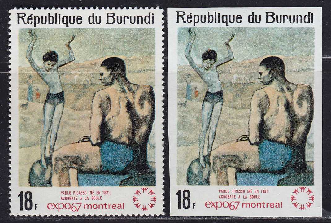 | N148871 | Бурунди 1967.. Живопись Пикассо. Серия 1 марка с зубцами и без (**) |  | 290 |  |
