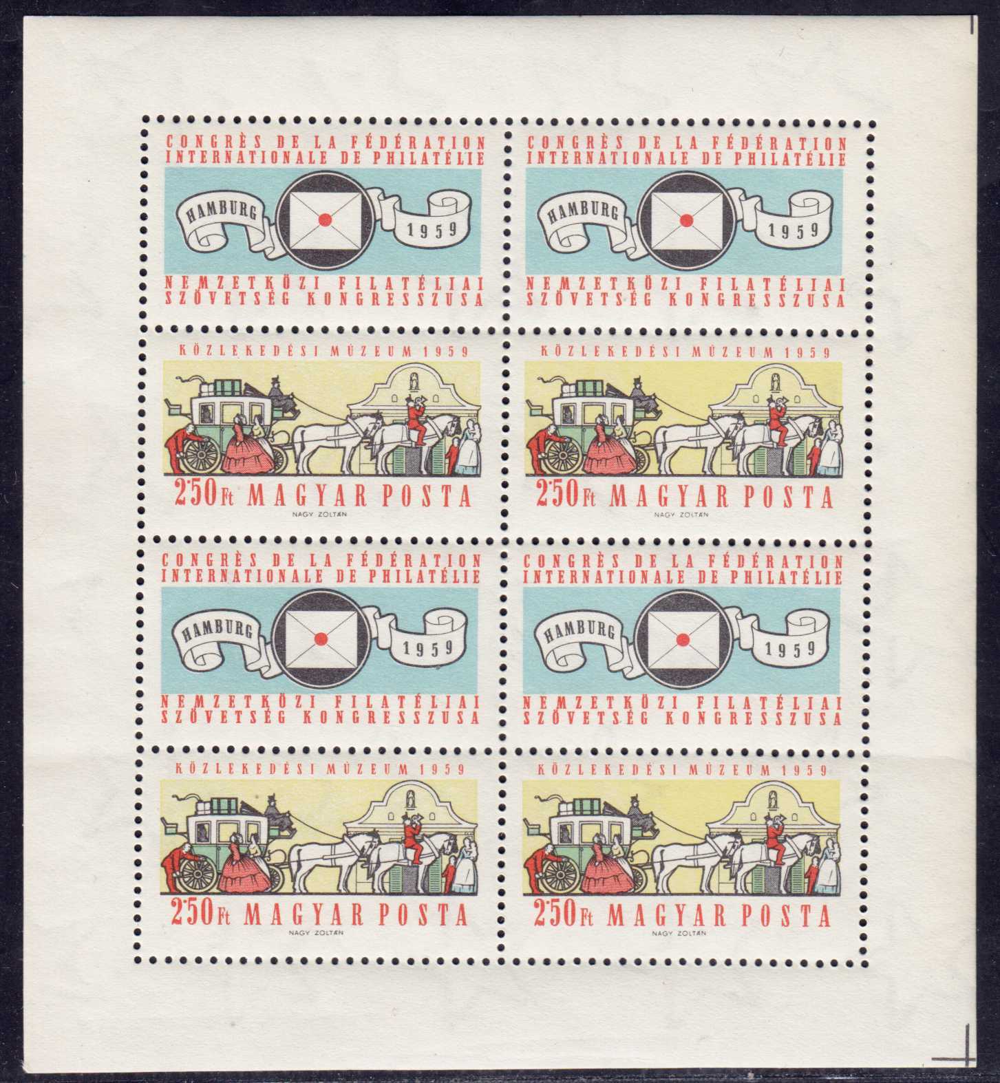 | N148703 | Венгрия 1959. Лошади и кареты. Сувенирный лист 4 марки с купонами (**) |  | 580 |  |