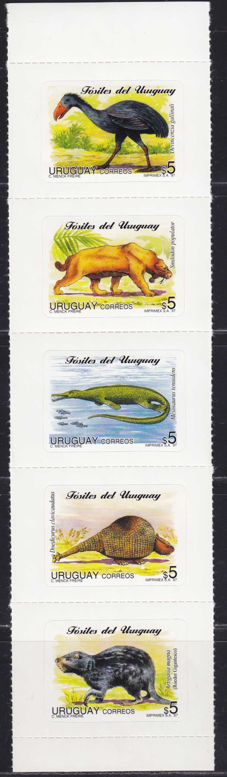 | N148659 | Уругвай 1997. Доисторическая фауна. Серия 5 марок-самоклеек в вертикальной сцепке (**) |  | 1080 |  |