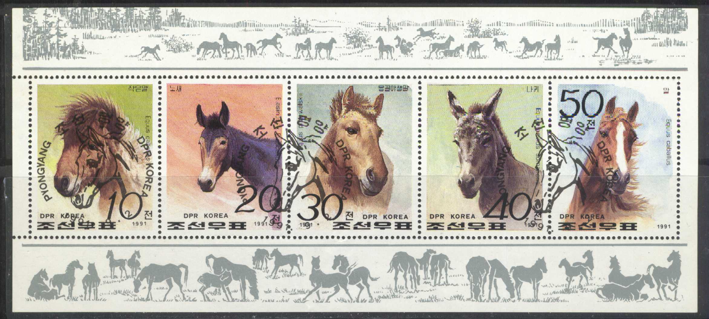 | N148677 | Корея 1991. Лошади Сувенирный лист 5 марок с памятным гашением |  | 175 |  |