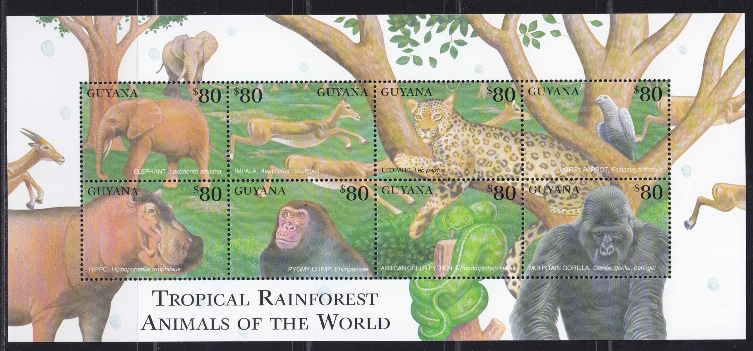 | N148608 | Гайана 2001. Фауна. Сувенирный лист 8 марок (**) |  | 580 |  |