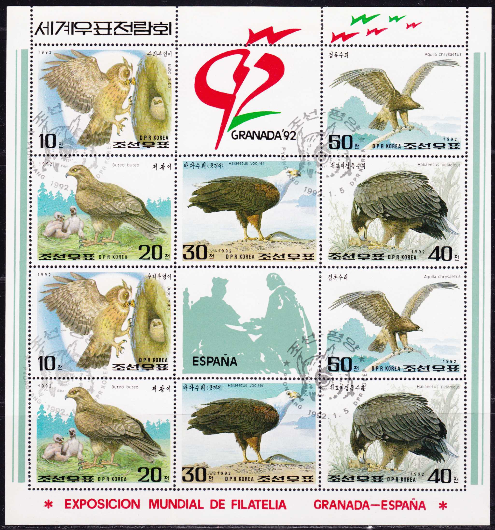 | N148530 | Северная Корея 1992. Птицы. Сувенирный лист 10 марок с купонами, гаш |  | 290 |  |